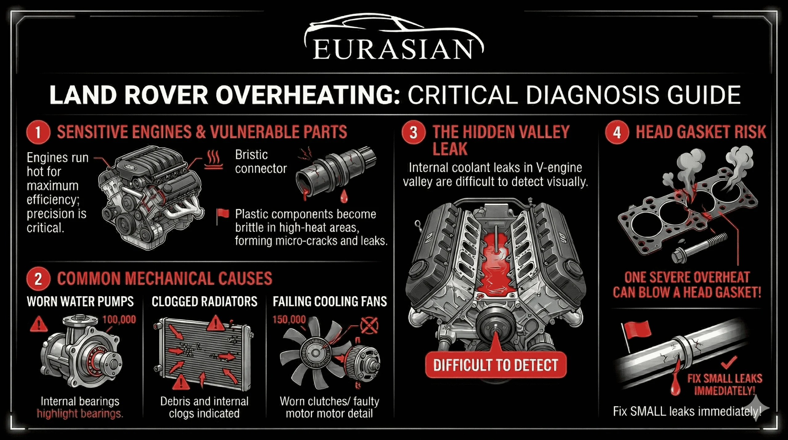 Because of this risk, Land Rover specialists, like the ASE certified mechanics at Eurasian Auto Repair recommend addressing cooling system problems as soon as they appear.